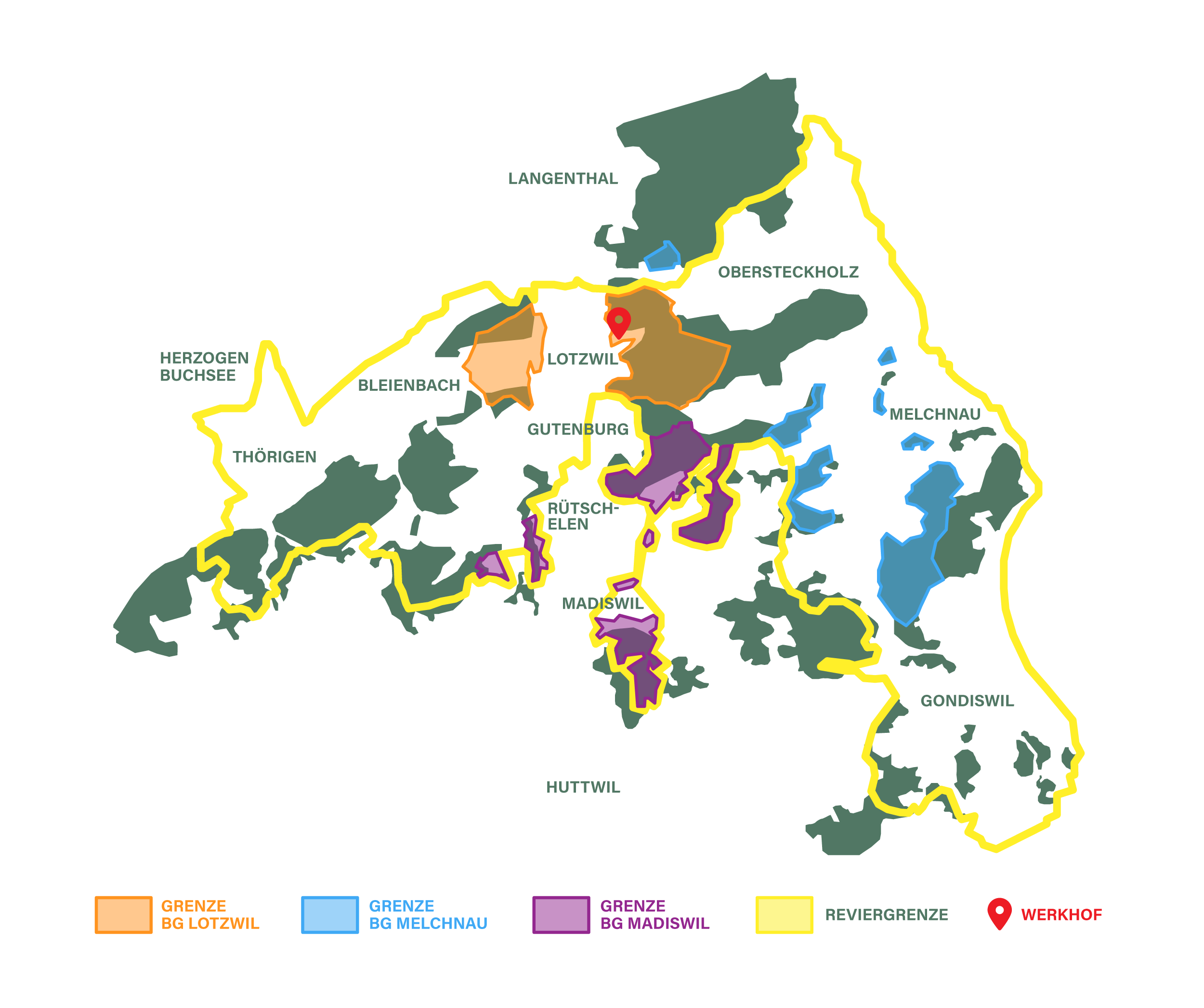 Das Einsatzgebiet von Regiowald plus umfasst die Waldbestände der Burgergemeinden Lotzwil, Madiswil, Melchnau, Bleienbach, Gondiswil, Rütschelen und Thörigen sowie privates Waldeigentum. Regiowald plus trägt die Verantwortung für 1646 Hektaren Waldfläche – Lebensraum für Mensch und Tier. Die von uns gepflegten Wälder werden gewissenhaft und ökonomisch sinnvoll und möglichst naturnah bewirtschaftet.